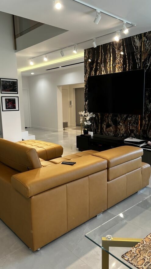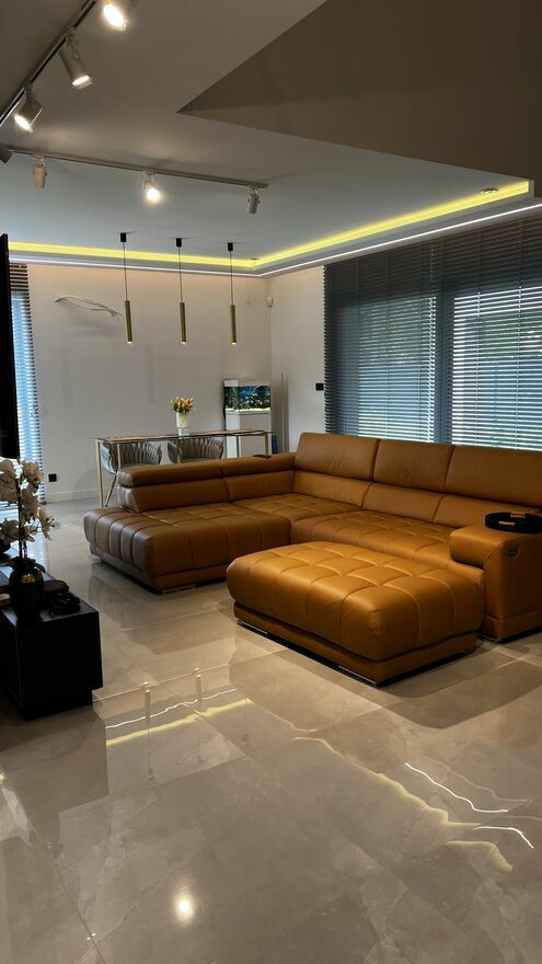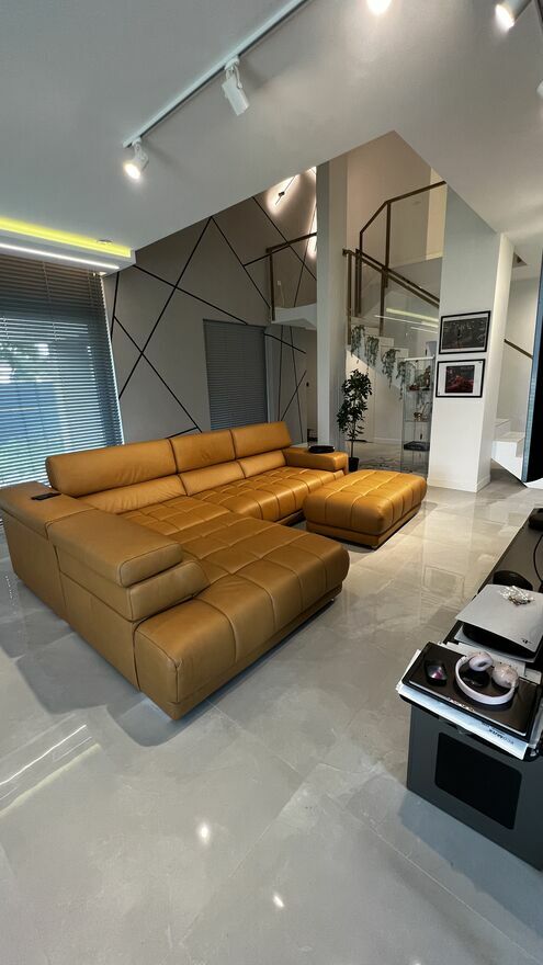 ️ kanapa w salonie na zamówienie z naturalnej skóry bydlęcej wraz z elektrycznie regulowanym siedziskiem